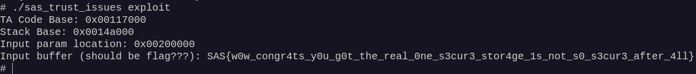 Now, you’ll need to exploit a vulnerability in the OP-TEE kernel itself to call privileged SMC handler and get the flag.
