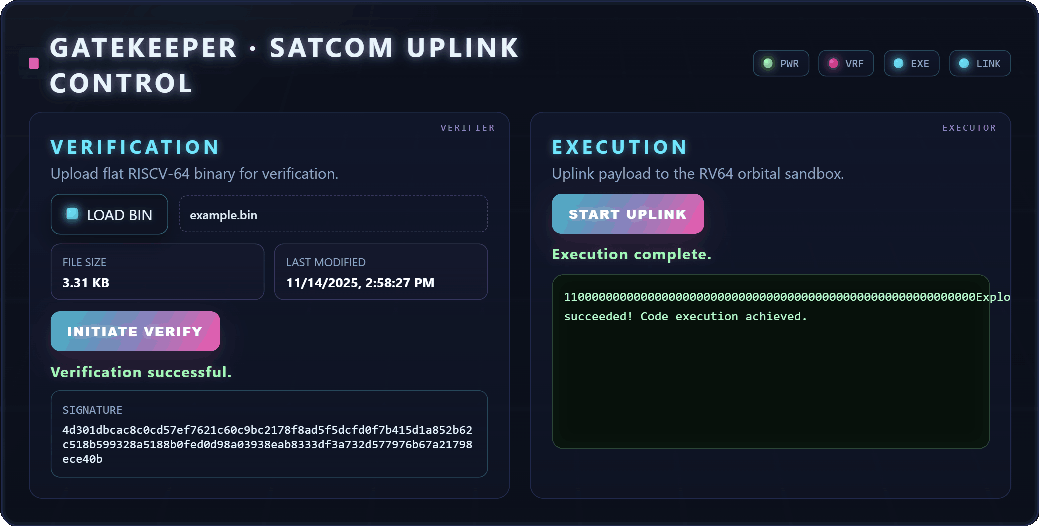 Last year I proposed to build a never-before-seen CTF A/D challenge for SASCTF 2025 Finals. With that began a months-long journey of designing and implementing a custom Triton-based symbolic verifier and QEMU machine for bare-metal RISC-V, with the goal of creating a unique exploitation challenge. And I believe me and my teammates succeeded! Here is the Gatekeeper story. Enjoy